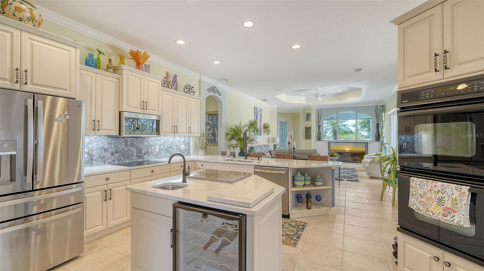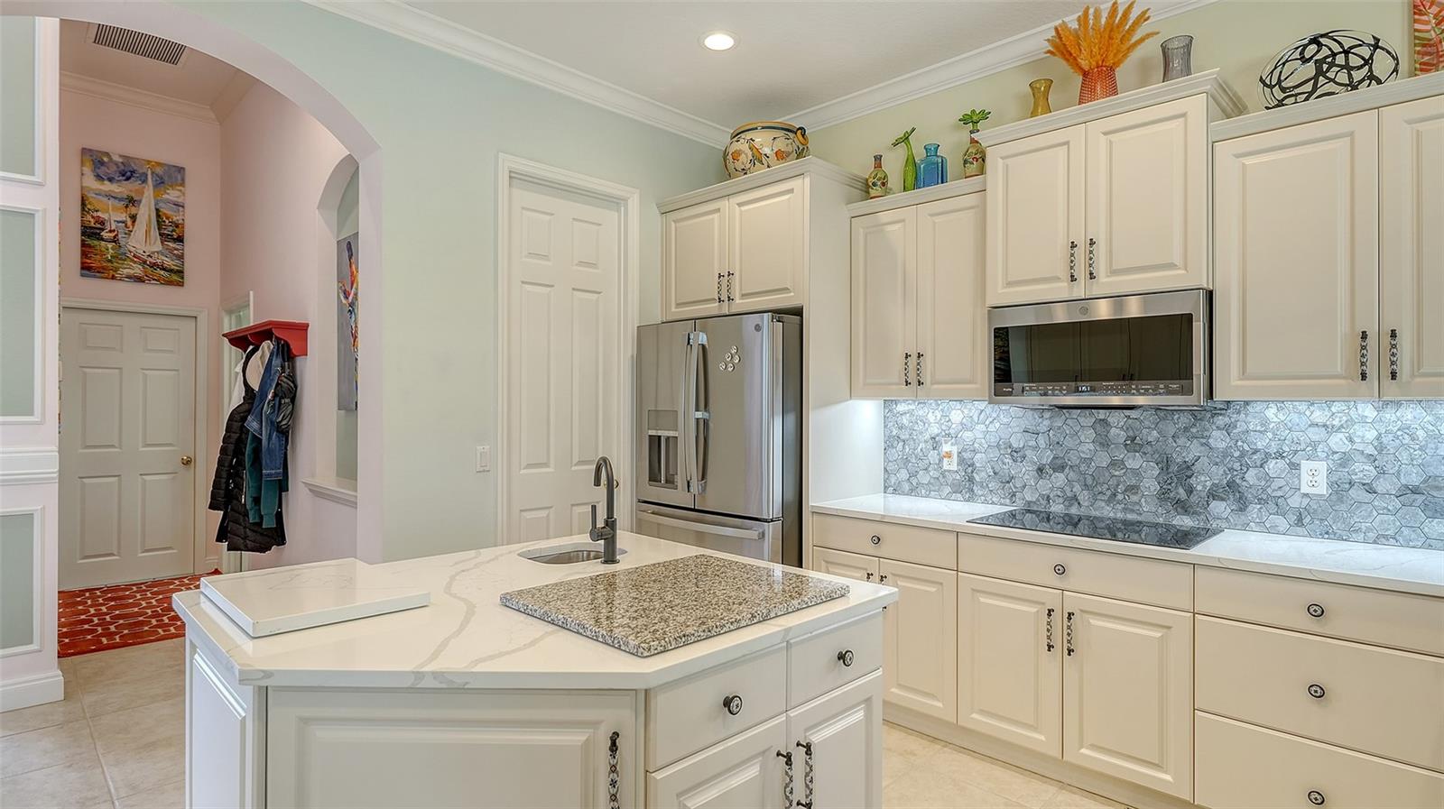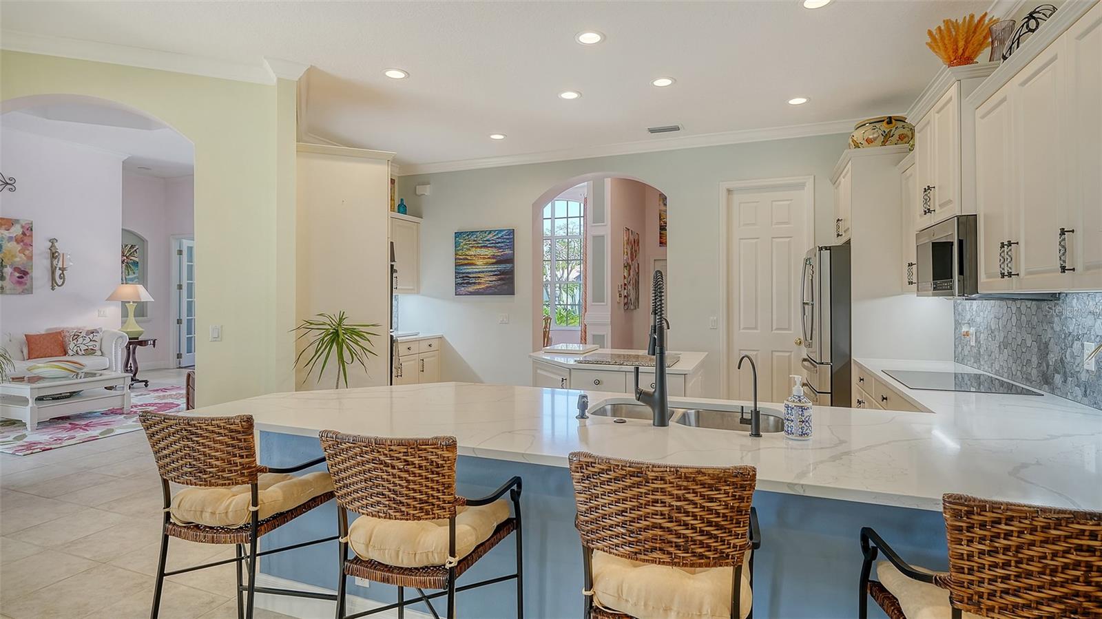 At the heart of the home lies a beautifully refreshed chef's kitchen, now featuring new quartz countertops, modern faucets, under-cabinet lighting, and upgraded refrigerator and cooktop--all combining to create a space that is both functional and stylish.